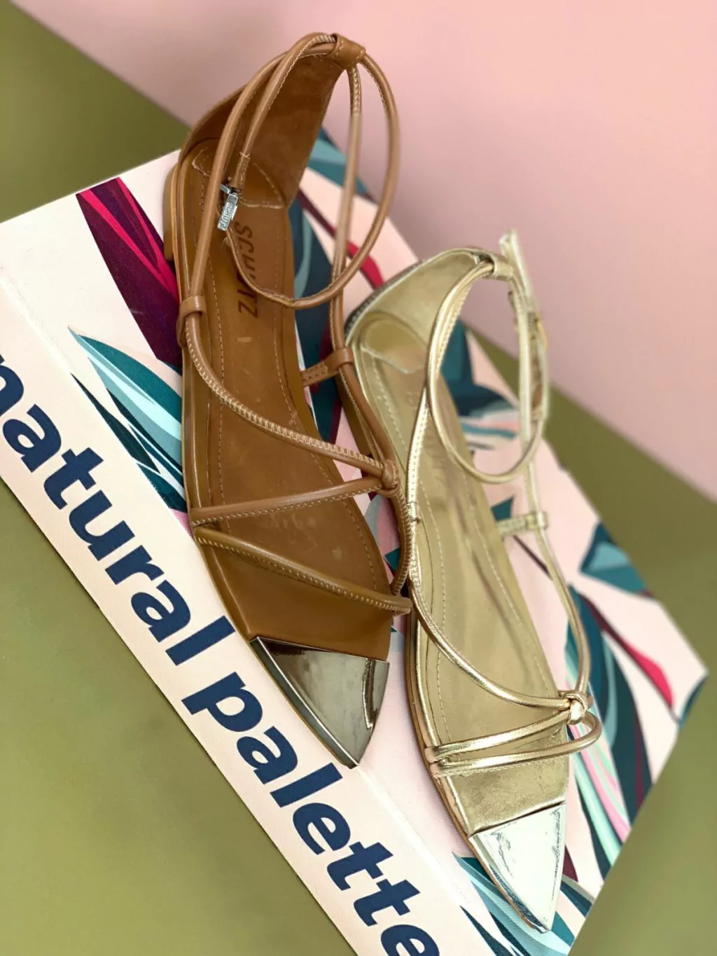 As tiras finas proporcionam um ajuste perfeito aos pés, enquanto o detalhe em metal dourado no bico acrescenta um toque de glamour e modernidade. A cor caramelo é perfeita para compor looks que transitam entre o casual e o chic, adaptando-se a diferentes ocasiões.